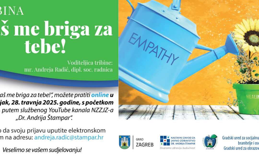 Dostavljamo vam poziv Službe za mentalno zdravlje i prevenciju ovisnosti NZJZ „Dr. Andrija Štampar“ na Tribinu za roditelje pod nazivom „Baš me briga za tebe!“, koja će se održati 28. travnja 2025. godine s početkom u 18,00 sati putem YouTube kanala. Ovom vas prilikom...